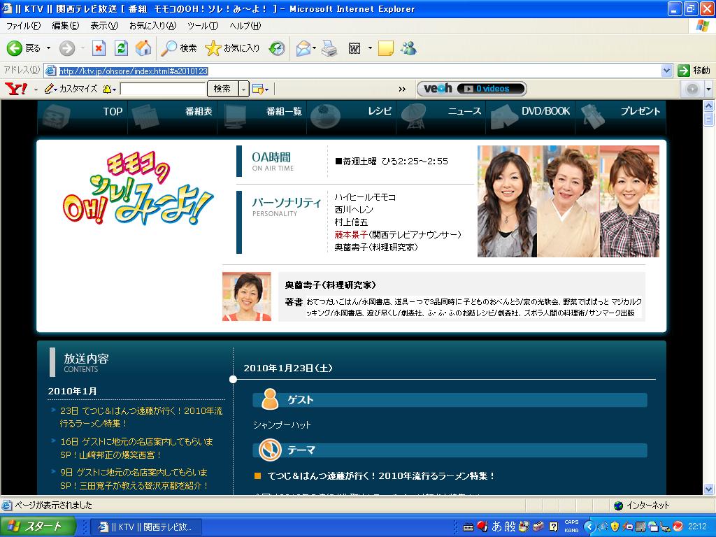 2010年01月22日 関西テレビ 明日、関西テレビに出ます〜 (自分じゃ見れないけど) 2009年1月23日(土) モモコのOH!ソレ!み〜よ!(関西テレビ) 午後2時25分〜2時55分 シャンプーハットの、てつじさんと一緒に ラーメンやさんを回りました。 「【TVラジオその他・出演】」カテゴリの最新記事 < 前の記事次の記事 >