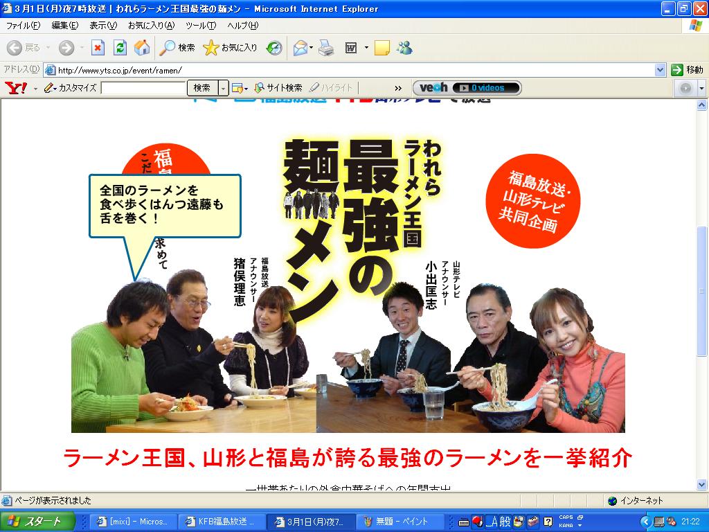 2010年02月28日 【明日TV出演】福島&山形 明日、福島と山形のテレビに出ます〜 われらラーメン王国 最強の麺メン 〜福島・山形 こだわりの一杯を求めて〜 2010年3月1日(月)19時〜20時 出演は佐野実、阿藤快、はんつ遠藤ほか http://www.yts.co.jp/event/ramen/ 福島放送と山形テレビのみの放映です。 自分でも見れませんが(汗) 見れる方は、よろしくお願い致しますm(__)m 「【TVラジオその他・出演】」カテゴリの最新記事 < 前の記事次の記事 >