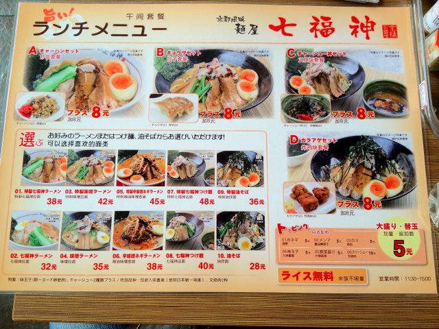 メニューを拝見すれば、七福神ラーメンの他に味噌、辛味噌、つけ麺、油そばなどと幅広いラインナップ。セットメニューも充実。