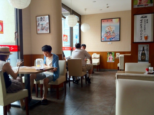 洛城広場というショッピングビルの1階で、外側からと、ビルの中からの2箇所から入れる造りになっているので、ガラス張りの壁面も多く、開放感があります。白を基調としてカウンターがちょこっとと、テーブル席が並ぶ店内は、日本に昭和からよくあるラーメン店のような雰囲気。