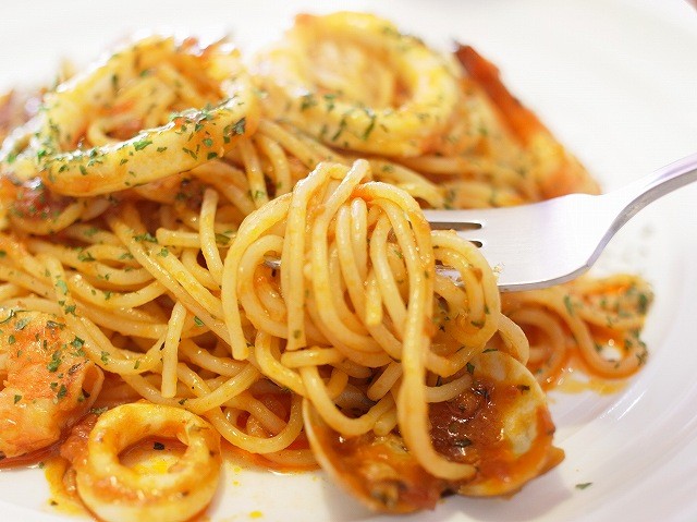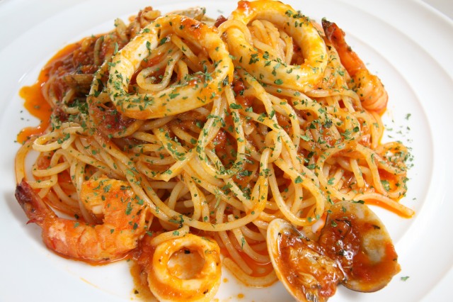 パスタもトマトソース、ミートソース、クリームソースなど様々なバリエーションがあるのですが、イチオシの「シーフードトマト」を頂きましょう!