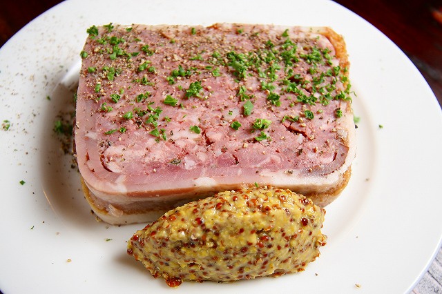 これは本店にもある一品で、「すみだモダン2011」にも認定されたメニュー。フランスのビストロでは必ずといって良いほどメニューにあるパテ。それを、地元で有名な田中肉屋さんから豚肉、牛肉、豚レバーを仕入れてパテにし、周りをベーコンで巻いた料理。