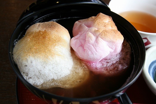 紅白の洒落たお餅が、ぜんざいのほんのり甘めな汁と一体化。