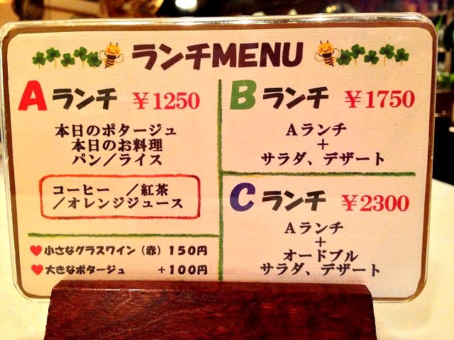 Aランチは本日のポタージュ、本日のお料理、パンorライス、コーヒーなど。