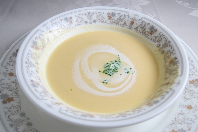 コーンポタージュスープですね。昨今のふわりとした口あたりではなく、あくまで王道のフランス料理たる、しっかりコクのあるスープ。古き良き時代を彷彿とさせます。