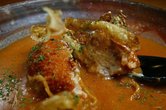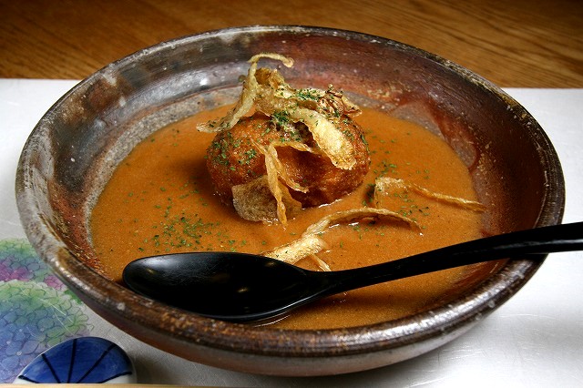 挽肉やキノコなどをすき焼き風に味付けしたクリームコロッケに、ココナッツミルク&デミグラスソースのルウがかかっています。いやいや、手間がかかっていますね。懐石さながらの料理を低価格で提供しているのも、嬉しい限り。