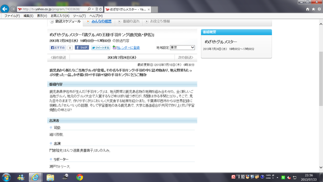 2013年07月23日 【テレビ出演】NHKめざせ!グルメスター お世話になっております。 はんつ遠藤です〜 明日、テレビ出演させていただきます! NHK−BSプレミアム 「めざせ!グルメスター」 2013.07.24(水)16:00−17:00 前回の再放送です。 内容は鹿児島県伊佐市の「手羽キング」 出演は 【司会】細川茂樹,【出演】門倉隆史,はんつ遠藤,奥薗壽子,はしのえみ,【リポーター】瀬戸カトリーヌ あと小林千恵アナウンサー よろしくお願いいたします♪ 「【TVラジオその他・出演】」カテゴリの最新記事 < 前の記事次の記事 >