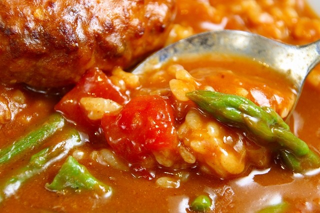 9月1日より新メニューとなったそうで、「チーズインハンバーグカレー プラス トマトアスパラ」(930円)を頂くことに。
