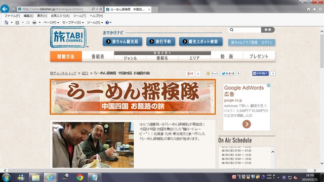 今、スカパー(CS)「旅チャンネル」では『ラーメン探検隊 中国四国お麺路の旅』を放送中です。