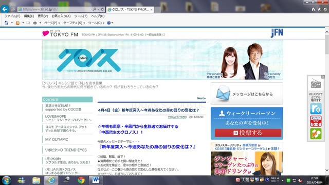 2014年04月02日 【ラジオ出演】東京FMクロノス お世話になっております。 はんつ遠藤です! ラジオ出演のお知らせ FMラジオ 東京FM 番組名:クロノス 2014年4月4日(金)朝8:35頃〜 テーマは、 ご当地やきとりテイスティングパークの 「全や連総本店 東京」に新しく仲間入りした 信州上田の「美味だれ焼き鳥(おいだれやきとり)」など よろしくお願いいたします! 「【TVラジオその他・出演】」カテゴリの最新記事 < 前の記事次の記事 >