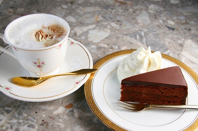 ミルクの泡を浮かべた、ウィーンで最も親しまれているコーヒーと、ザッハートルテの組み合わせです。