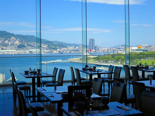 そんな建物の規模に、のっけから驚いてしまったのですが、実際のレストランが5Fにあるというのも驚愕。エレベーターで5Fへと昇れば、店内の先に広がる長崎の海に、感動すら覚えてしまいます。