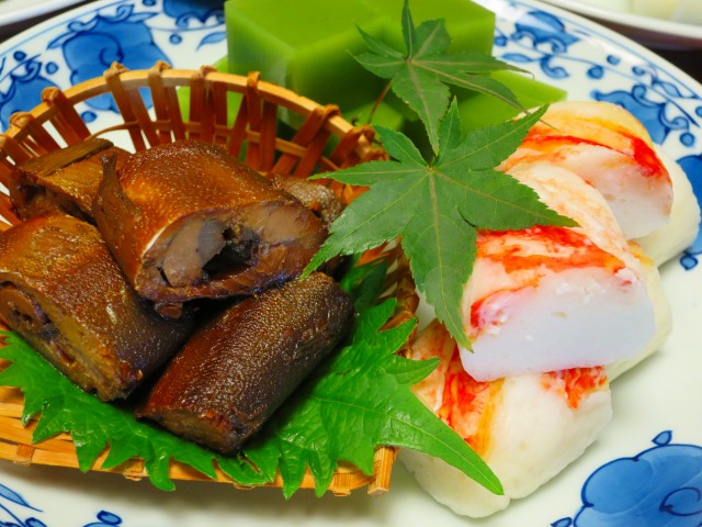 三品盛・・・抹茶寒天や、鮎の甘露煮、蟹しんじょう