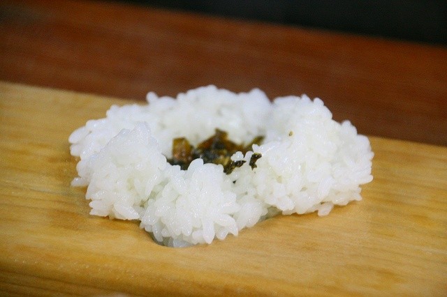 調理工程を拝見したら、なるほど、おにぎり用の「木型」があるんですね。