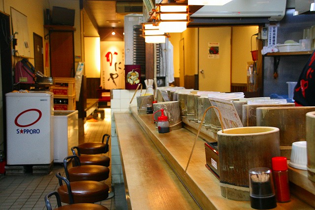 店内に入れば、白木の分厚く長いカウンター。そして、奥にはテーブル席と小上がり。特にカウンターは2段になっていて、厨房側が高く、客席側が低い作りは、寿司店を想像させます。