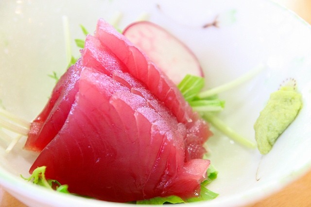 お刺身。時期によって、しびんまぐろ、鰤など旬のお刺身が並びます。