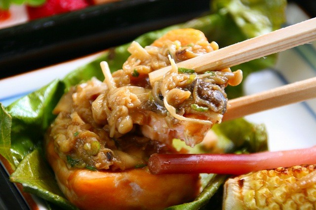 樟葉焼きは、蓋を開いた時は、樟葉に包まれておりましたが、写真のために開けました。