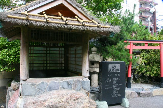 玄関前の東屋で、天然の温泉が噴出しています! 創業以来、湯元としても古く、57.6℃の自家源泉が尽きることなく湧きでているそう。 湯量も毎分127リットルと豊富で、透明な湯が一日中、湯舟を満たしています。泉質は、ナトリウム・カルシウム塩化物泉。