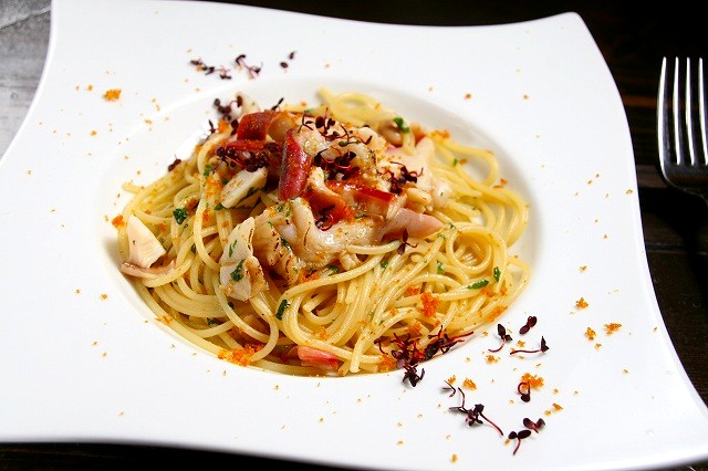 イタリアはバリラ社のパスタを使用した一品。活北寄の新鮮さと、ボラのからすみの美味しさが、上手にバランスを取っています。