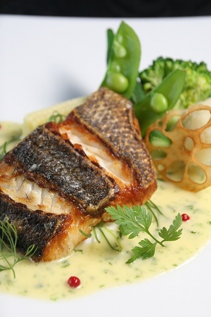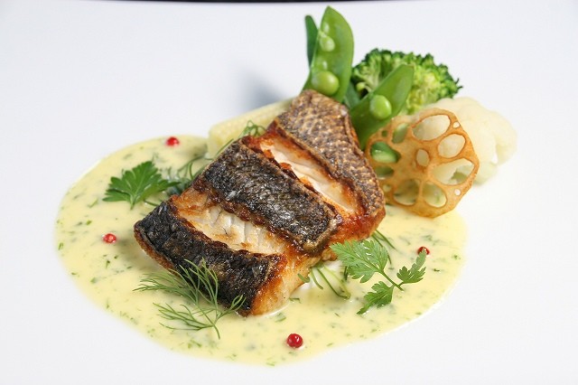 鮮魚料理は、今日は、いさきのポアレ 白ワインとバター ブールブランソースに青のり
