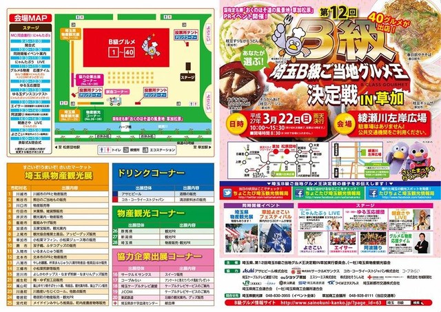 2015年03月22日 【出演】第12回埼玉B級グルメ王決定戦in草加にゲスト出演しまーす(^0^)/ 40グルメが出品する、 第12回埼玉B級グルメ王決定戦in草加、 本日2015.3/22(日)10:00-15:30開催 (松原団地駅徒歩8分の綾瀬川左岸広場)。 僕も11:10-11:50のステージイベントに登場させて頂きます! ぜひ遊びに来て下さい(*^^*) 「【TVラジオその他・出演】」カテゴリの最新記事 < 前の記事次の記事 >