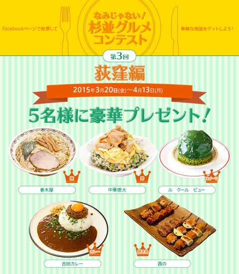 「たべあるキング」と「杉並区」(杉並あるあるプロジェクト)とのコラボ企画「なみじゃない!杉並グルメコンテスト」ですが、