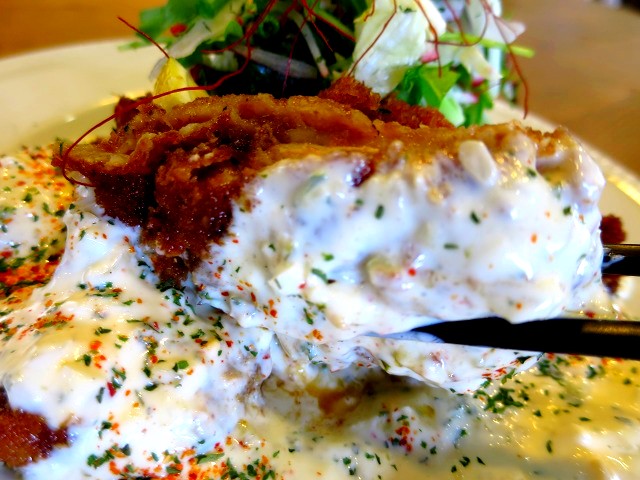 チキンカツを頂けば、これまたボリュームたっぷり。鶏肉自体も柔らかくて美味。そして想像よりもずっとサクサクっとした衣の食感に驚きます。