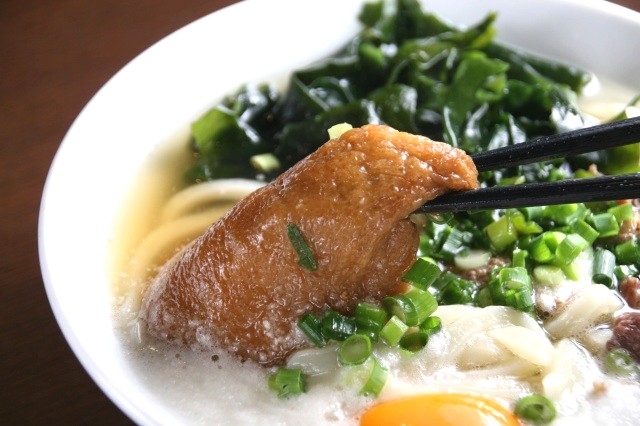 きつね(油揚げ)が特に美味!ふんわりとした大きいタイプで、甘めに味付けがなされています。