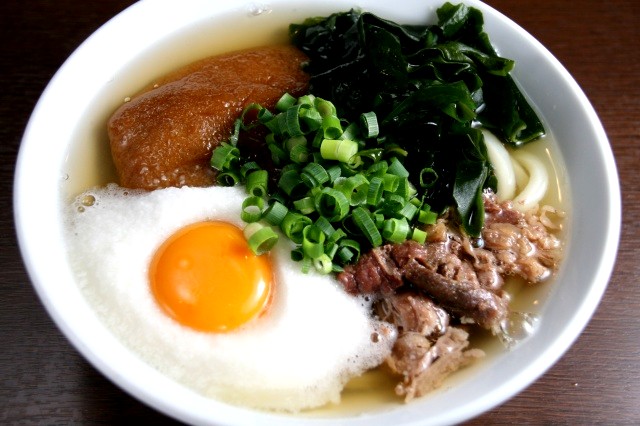 麺と汁、そして牛肉やワカメ、きつね(油揚げ)、卵黄、そして白身かと思ったら、とろろ芋ですねー。