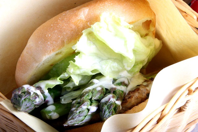 美瑛産の太いアスパラを用いたハンバーガーです。もちろん収穫できる時期しか、ありません。