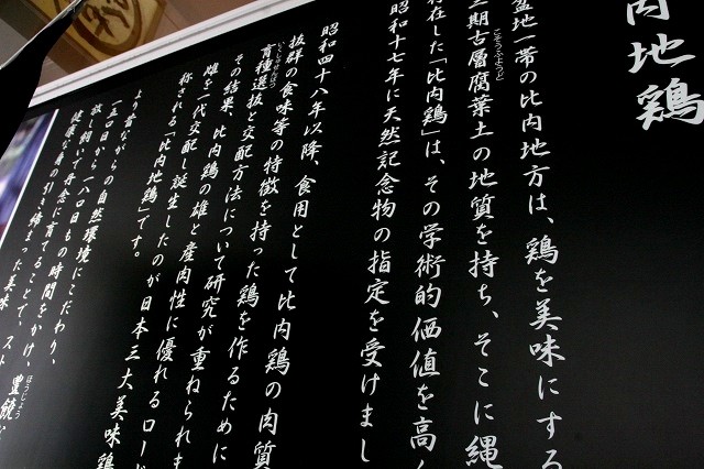 比内地鶏は天然記念物である雄の比内鶏と、雌のロードアイランドを一代交配して誕生した地鶏です。そんな話が店頭に大きく掲げられております。