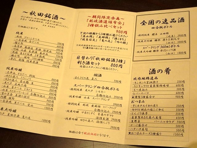 確かにドリンクメニューを拝見したら秋田の地酒が、ずらり。利き酒セットが気になります♪その他、全国の銘酒や、日本酒に合う一品料理も。