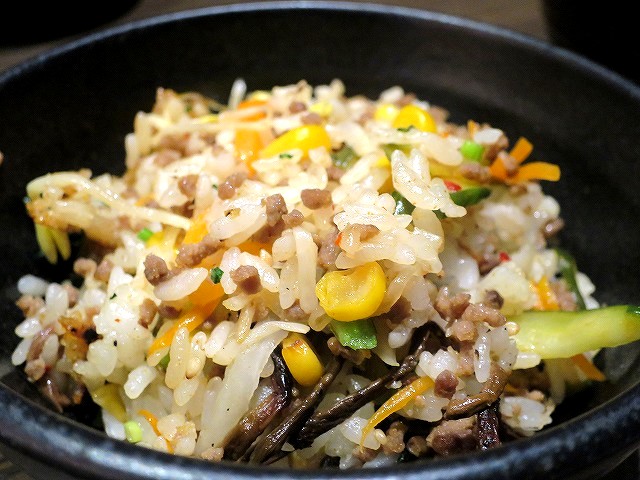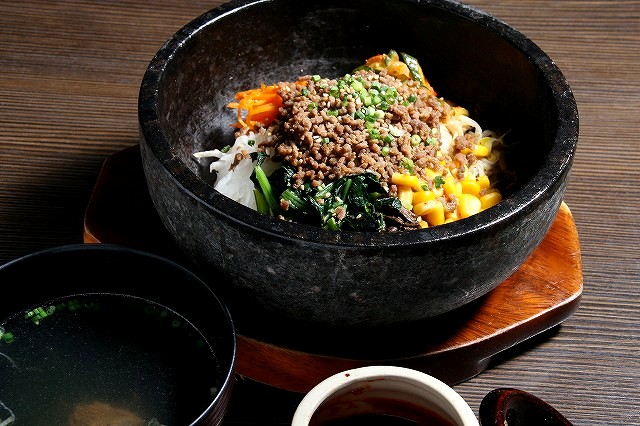 新鮮な野菜を使用した自家製の7種のナムルと肉そぼろが、あきたこまちに彩り鮮やかに盛られた石焼ビビンバ。