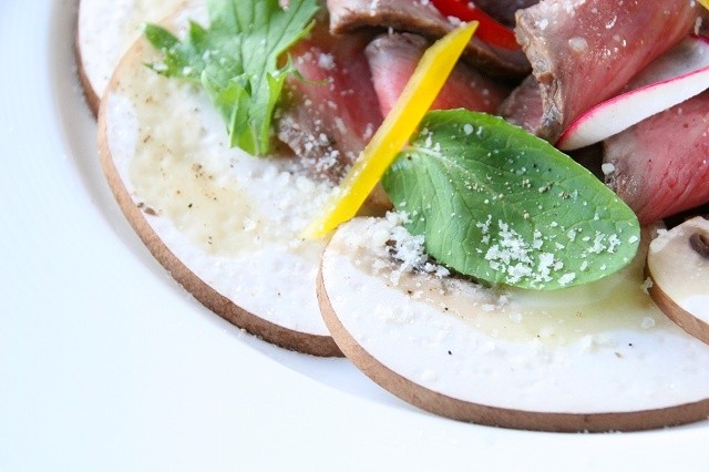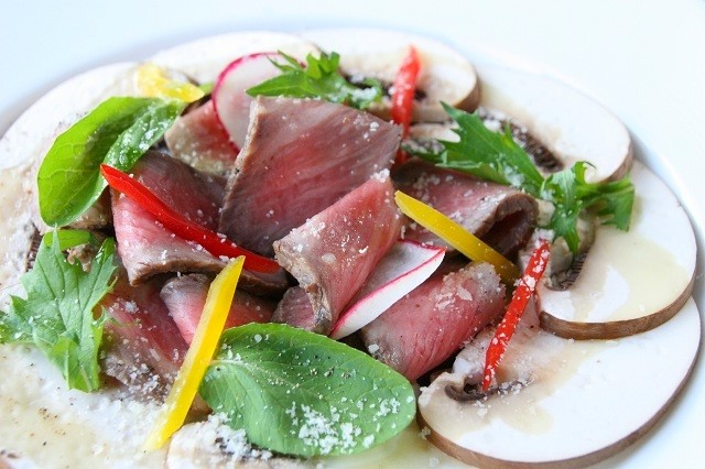 「十勝和牛ローストとジャンボマッシュのカルパッチョ」