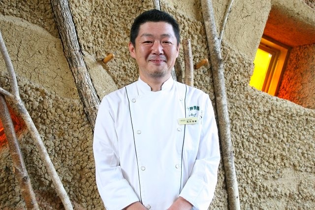 「この壁は、地層をイメージしたそうです。十勝の土も混ぜてあるんですよ。ところどころにあるのは、白樺の木です」と総料理長の馬渕善範さん。なんでも、久住さんという有名なデザイナーさんの作品なんだとか。そのため、全国の左官屋さんが見学に来るそう!
