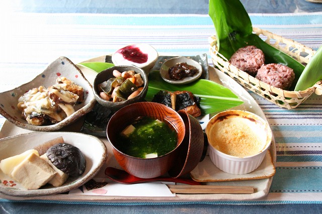 今回の料理は、ミナ貝を油みそで合わせたものや自家製のさつまいも、地元のピーナッツを用いた五目煮、黒米赤米のおにぎり、鯖など。