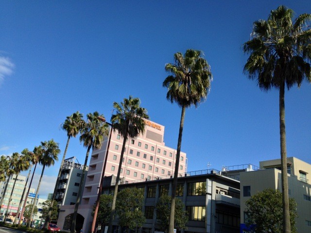 ワシントンパームが立ち並ぶ南国の雰囲気に青い空が映えますね。