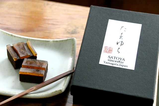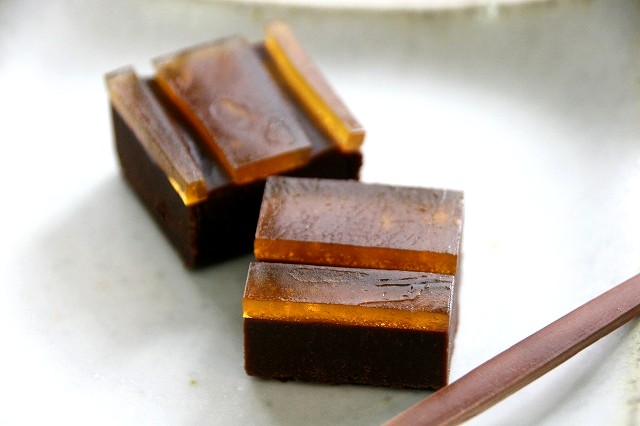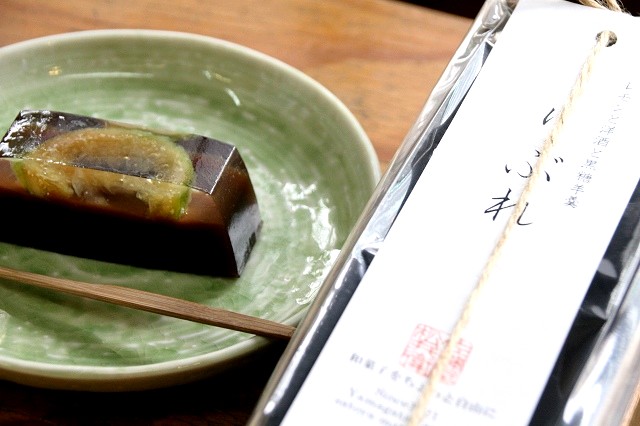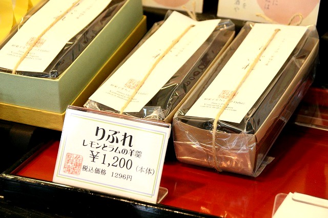 実は梅のような“酸”と寒天は一緒にできないという定説があるそうで、でも、それをクリアーしたのが「乃し梅」。その製法を応用して、完成したのが「りぶれ」。愛媛は怒和島産の樹上で熟したレモンを丁寧に佐藤屋で蜜漬し、皮ごと全部浮かべた羊羹。羊羹は小豆と黒糖、ラム酒を加えて濃厚に仕上げ、レモンの酸味とほのかな苦みが後味をさっぱりとさせてくれる、しっかり和菓子なのにどこか洋の雰囲気を併せ持つ、面白い一品。羊羹嫌いでも美味しく味わえます。