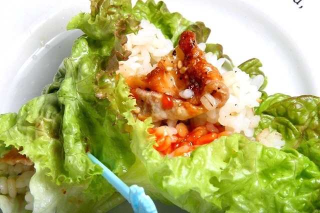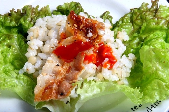 今度はサニーレタスと麦飯、豚カルビ、そして家にあったコチュジャンで、韓国風の野菜巻きスタイルを。