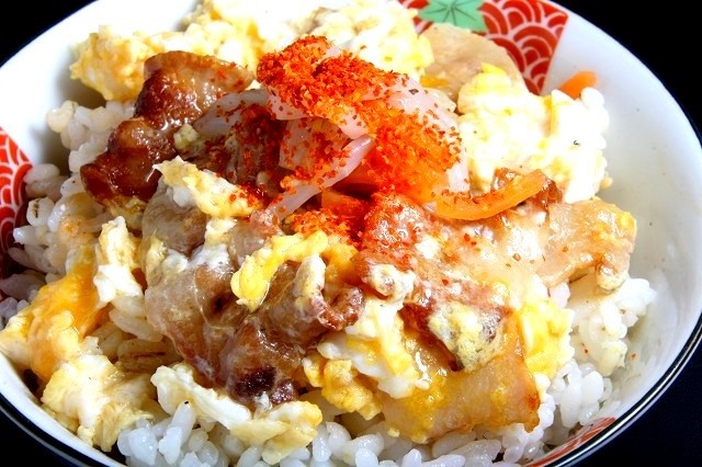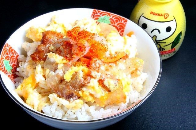なので、残りは、親子丼みたいに、豚カルビと生卵で卵とじにして、麦飯にのっけてみました。そのままだと卵の甘さが前面に出ちゃうので、別添えのもやし人参ナムルに一味唐辛子をかけて、ピリ辛のアクセントを効かせたところ、これがイケるのなんの!! しかも、レモン果汁もかけてみたぞ!!
