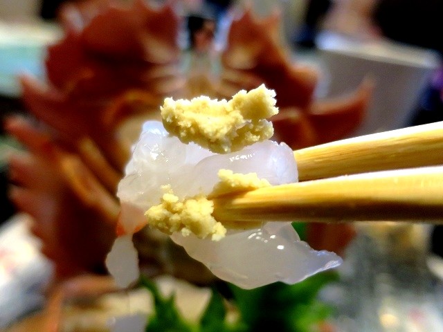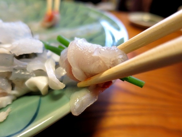 いわゆるトラフグの刺身ですね。薄造りなので、何枚か重ねて、ネギを巻いて、ポン酢やもみじおろしで味わうと、格別♪ 鮮度が違いますねぇ。