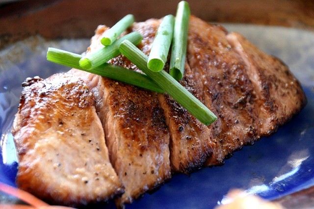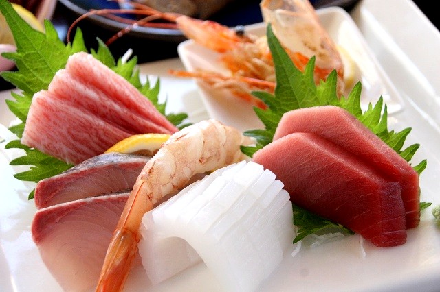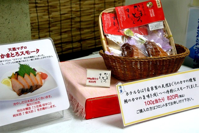 ホテルのレストランで天然まぐろや土佐和牛などを味わう