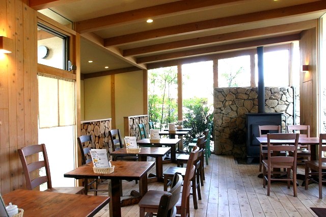 木目を活かした店内に、暖炉が灯る、素敵な空間。