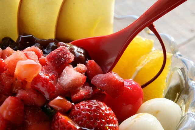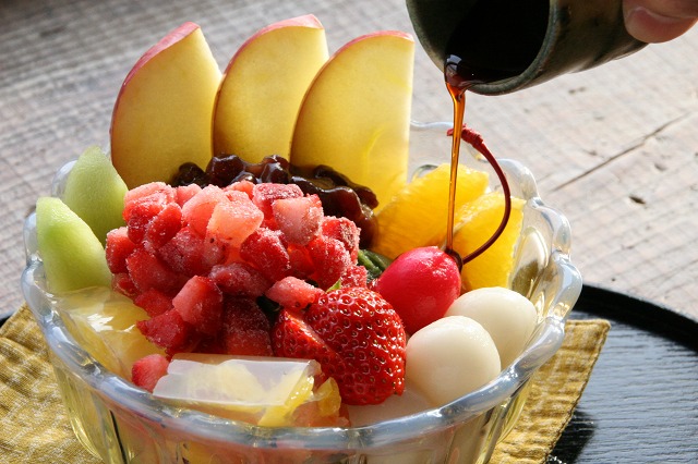 彩りも華やかです。お茶餡と自家製のフルーツ寒天、抹茶ゼリーが良く合います。