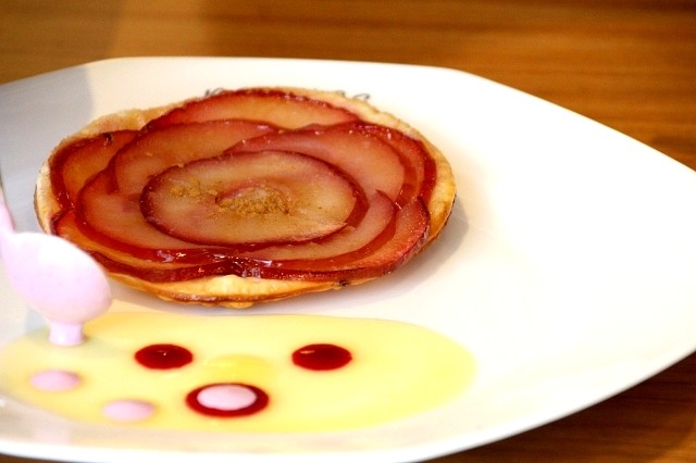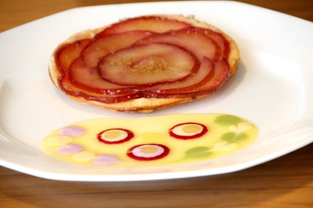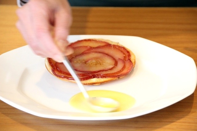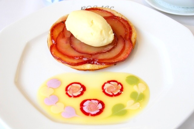 テーブルに運ばれてから、フルーツソースなどでドレッサージュ。