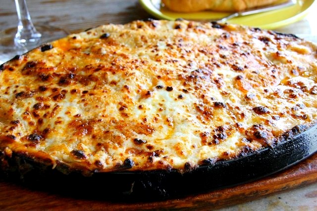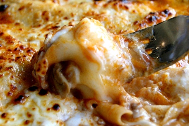 ホワイトソースとミートソース、チーズ、パスタが軽く層をなした、熱々のオーブン料理。