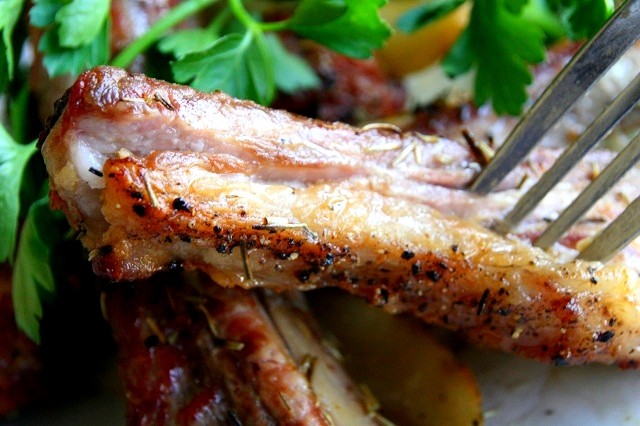 骨付きの豚肉のジューシーさとワイルドさがたまりません。ハーブなどの香草の香りも素敵です。