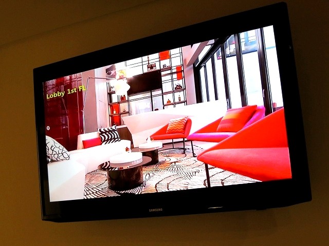 テレビは壁の上部に備え付けのタイプでした。