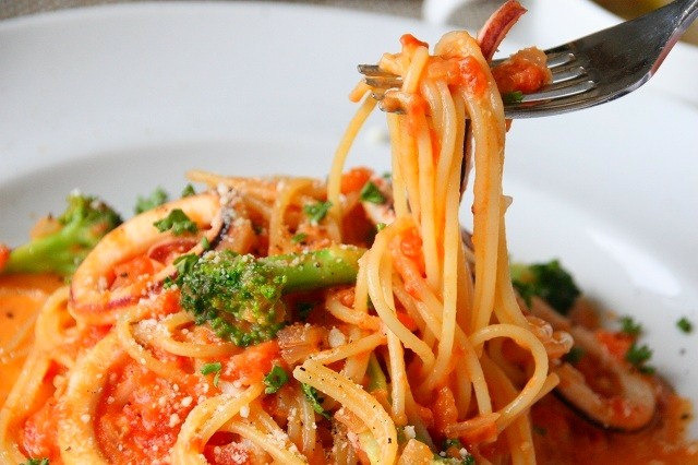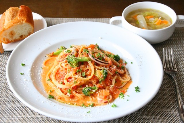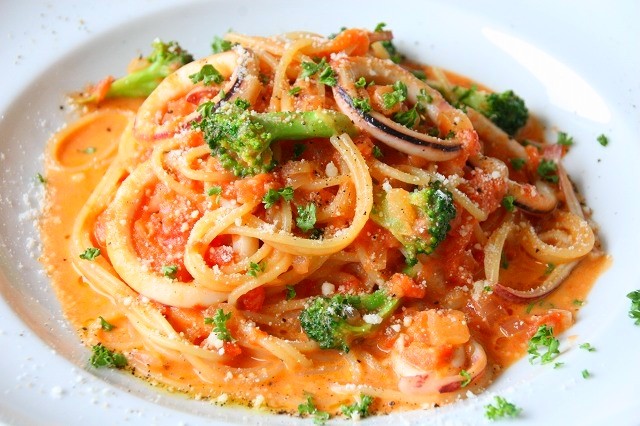 パスタは数種類から選べます。写真は「イカと旬野菜のトマトクリームスパゲッティ」