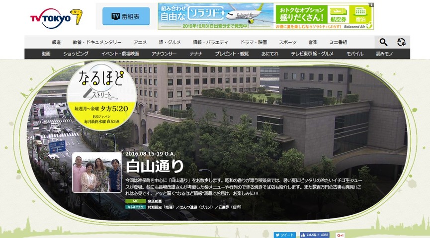 2016年08月19日 【テレビ出演】本日最終日:テレビ東京「なるほどストリート」 お世話になっております。 はんつ遠藤です〜。 15(月)から19(金)までの5日間、毎日、テレビ東京に出演させて頂いております。 テレビ東京系列「なるほどストリート」 本日最終日。2016年8月19(金)も、午後5時20分〜5時45分 榊原郁恵さんたちと、白山通りを歩いていまして、今日はついに水道橋へ。 よろしくお願いいたします(*^^*) 「【TVラジオその他・出演】」カテゴリの最新記事 < 前の記事次の記事 >